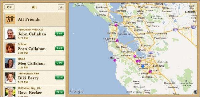 Da Apple Encontre meus amigos O aplicativo para iOS 8.0+, visto acima, oferece funcionalidade semelhante com a capacidade de verificar locais e definir alertas de localização.