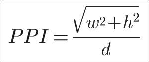 A partir daqui você pode dividir o comprimento diagonal em pixels pelo comprimento diagonal em polegadas para obter a densidade do pixel no PPI. Isso pode ser expresso como a seguinte fórmula matemática, onde C é largura, H. é altura e D. é o tamanho da tela diagonal em polegadas:
