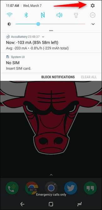 Mas vamos mantê-lo o mais simples possível aqui. Vá em frente e abra o menu de configuração do seu telefone, puxando para baixo a aba de notificação e, em seguida, tocando no ícone de engrenagem.