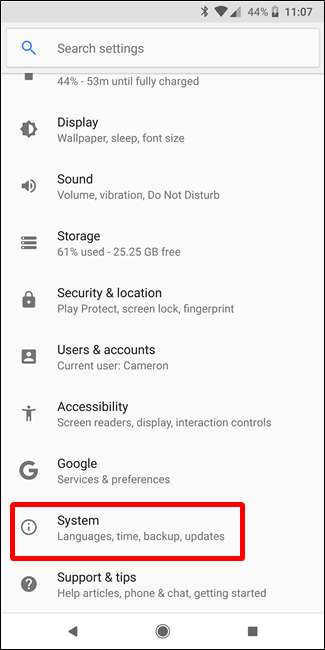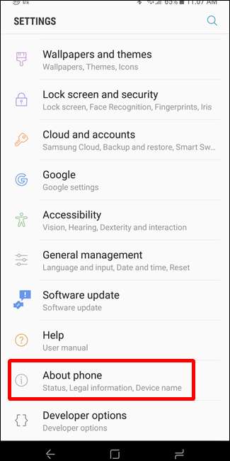A partir daí, role até a parte inferior do menu e toque na entrada “Sobre o telefone” (também pode ser “Sobre o dispositivo”). Se o seu telefone não tem essa opção, provavelmente está executando o Oreo, que recebeu uma revisão dramática das configurações. Nesse caso, procure a opção “Sistema”.
