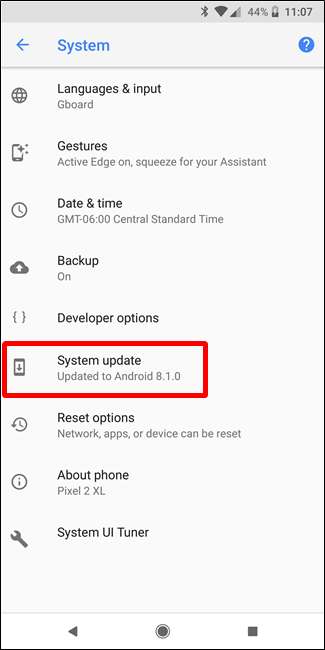 Deve haver uma entrada para a versão do Android - novamente, dependendo do dispositivo e da versão do Android, pode ser diferente. No Oreo, você pode encontrar as informações da versão na seção “Atualização do sistema”.