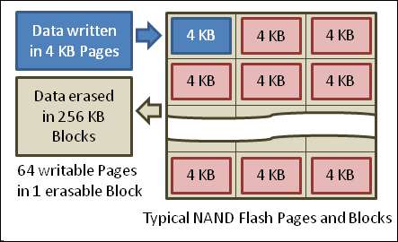 A memória Flash NAND grava dados em páginas de 4 KB dentro de blocos de 256 KB. Para adicionar páginas adicionais a um bloco parcialmente preenchido, a unidade de estado sólido deve apagar o bloco inteiro antes de gravar os dados de volta nele.
