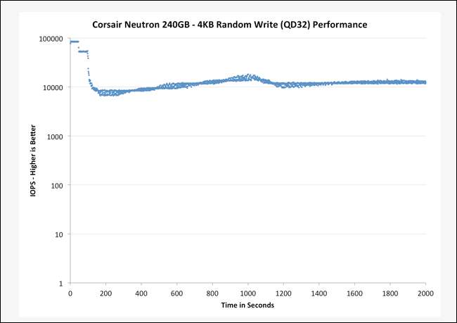 Anandtech realizou uma variedade de benchmarks com unidades diferentes para descobrir a relação entre a área sobressalente de uma unidade de estado sólido e a consistência de seu desempenho de operação de gravação. Ao preencher uma unidade vazia, eles encontraram alto desempenho de gravação logo no início do processo e uma queda significativa à medida que as operações de gravação continuavam a preencher a unidade.