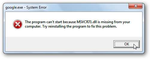 La unul dintre testele noastre, am primit o eroare spunând asta MSVCR71 lipsea din computerul nostru, așa că GoogleCL nu a putut rula. Aceasta este o bibliotecă de execuție C ++ în Windows și majoritatea programelor care au nevoie de ea o includ cu fișierele lor de programe. GoogleCL nu include această DLL în fișierul zip, deci va trebui să găsim o copie pentru aceasta.