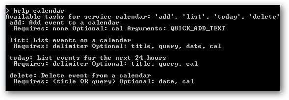 Puteți utiliza GoogleCL pentru a accesa serviciile de pe Picasa, Blogger, YouTube, Docs, Contacte și Calendar prin interfața din linia de comandă și ne-ar plăcea să vedem că versiunile viitoare vor include suport pentru mai multe articole, inclusiv Gmail și Căutare. Deocamdată, însă, aceste servicii sunt încă utile. introduce Ajutor urmat de un nume de serviciu pentru a vedea mai multe informații despre acesta și câteva exemple de utilizare. Aici vedem ajutorul pentru Calendar.