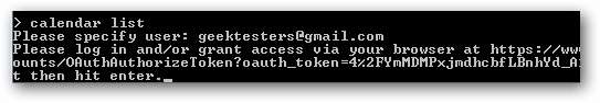 Când utilizați pentru prima dată un serviciu, va trebui să vă activați computerul cu acesta online. De exemplu, dacă am dori să vedem toate programările din Calendarul nostru, am intra Lista calendaristică . Vi se va cere să specificați un utilizator; introduceți adresa de e-mail Gmail. Apoi, vi se va solicita să aprobați accesul în browserul dvs., iar pagina de aprobare se va deschide automat în browserul dvs. implicit.
