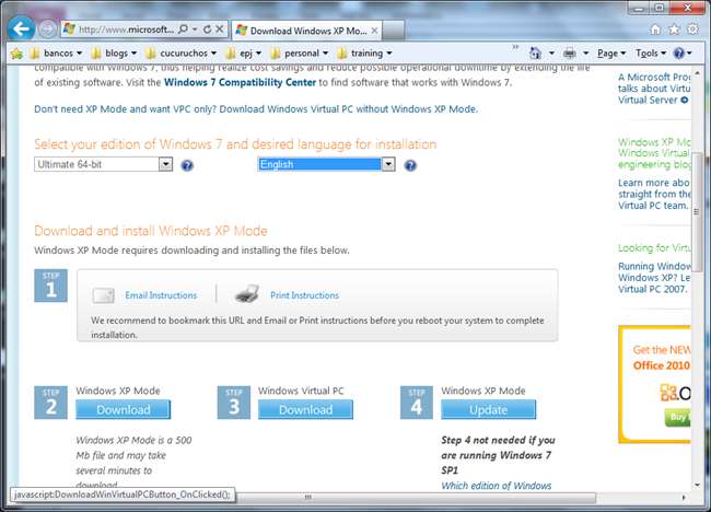 Mai întâi, trebuie să descărcați computerul virtual de pe Microsoft’s web site . Va trebui să vă asigurați că selectați ediția Windows 7 potrivită din meniul derulant și apoi selectați Windows Virtual PC.