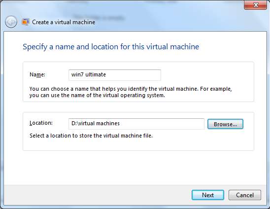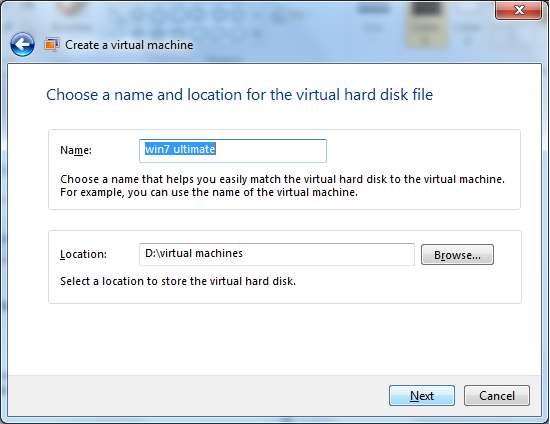 Acum, puteți scrie numele noii mașini virtuale și locația de stocare a fișierului mașinii virtuale.