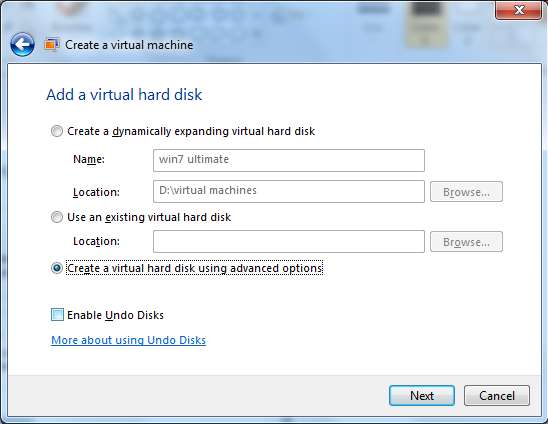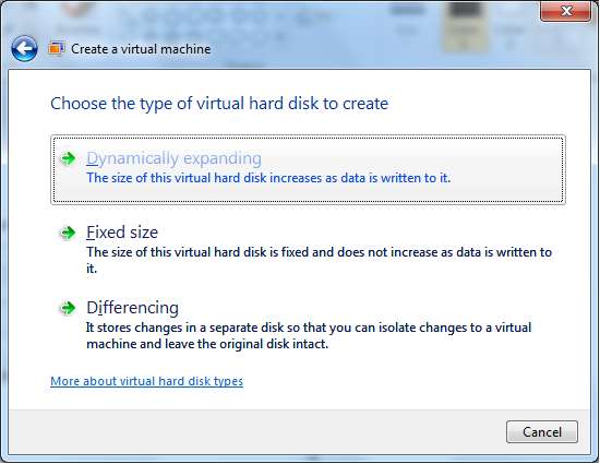 În fereastra de opțiuni avansate, puteți selecta să creați un hard disk în expansiune dinamică (unitatea de disc va crește pe măsură ce mașina dvs. virtuală are nevoie), o unitate de disc de dimensiuni fixe (alocați cantitatea de stocare pentru aceasta) și o unitate de disc diferențiată ( modificările vor fi stocate pe un alt hard disk, astfel încât hard diskul original să poată fi intact)