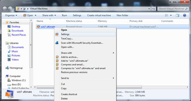 Puteți merge din nou la Virtual PC și veți găsi noua mașină virtuală. Faceți clic dreapta pe acesta pentru a selecta setările sau faceți clic pe meniul Setări.