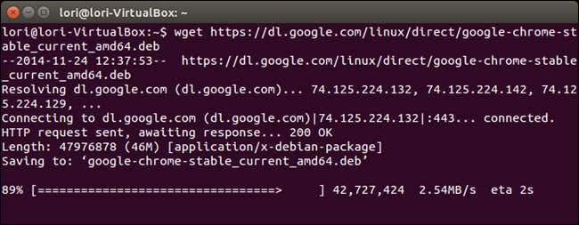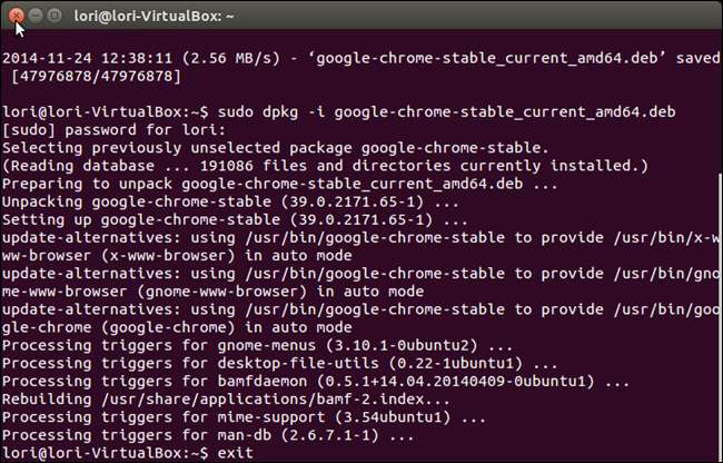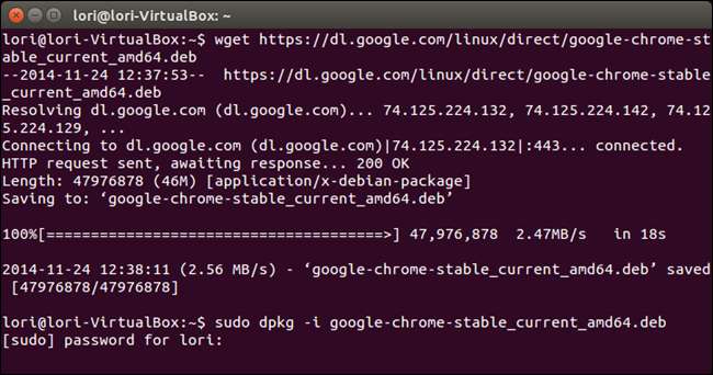 NOTĂ: Comanda de mai sus va funcționa atâta timp cât nu ați schimbat directorul de la descărcarea fișierului. Dacă ați schimbat directorul după descărcarea fișierului, adăugați calea completă la fișier. De exemplu, „/home/lori/google-chrome-stable_current_amd64.deb”.