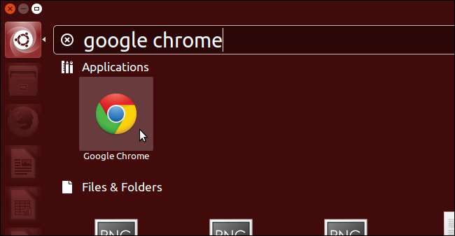 Pentru a deschide Google Chrome, faceți clic pe butonul Dash din partea de sus a Unity Launcher și tastați „google chrome”. Elementele care corespund expresiei încep să se afișeze sub caseta de căutare. Când se afișează elementul „Google Chrome”, faceți clic pe acesta pentru a porni Chrome.