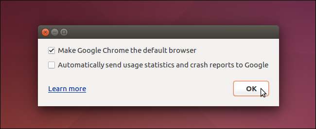 Prima dată când deschideți Chrome, se afișează următoarea casetă de dialog. Dacă doriți ca Google Chrome să fie browserul dvs. implicit, lăsați bifată caseta de selectare „Setați Google Chrome browserul implicit”. Dacă nu, bifați caseta de selectare pentru a elimina cecul din casetă și dezactivați opțiunea. De asemenea, puteți alege să „Trimiteți automat statistici de utilizare și rapoarte de blocare la Google”. Faceți clic pe „OK” după ce ați făcut alegerile.