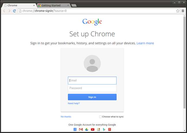 Google Chrome se deschide la pagina „Configurați Chrome”. Dacă utilizați Chrome pe alte platforme, cum ar fi Windows, și aveți marcaje, istoric etc. pe care le-ați sincronizat cu contul dvs., vă puteți conecta și descărca aceste elemente în această copie a Chrome. Utilizați linkul „Alegeți ce să sincronizați” din partea de jos a paginii pentru a alege să sincronizați numai anumite elemente din contul dvs. Dacă nu doriți să vă sincronizați cu contul dvs., dați clic pe linkul „Nu mulțumesc” din partea de jos a paginii.