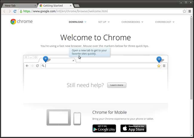 Există o a doua filă deschisă atunci când rulați Chrome pentru prima dată. Această filă afișează o pagină „Bun venit la Chrome” care vă oferă câteva sfaturi despre utilizarea Chrome. Pentru a afla mai multe, faceți clic pe butonul „Aflați mai multe”.