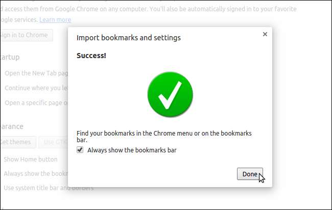 Se afișează o casetă de dialog care arată că marcajele și setările au fost importate cu succes. Aici puteți alege „Afișați întotdeauna bara de marcaje”, dacă doriți. Faceți clic pe „Terminat” pentru a închide caseta de dialog.