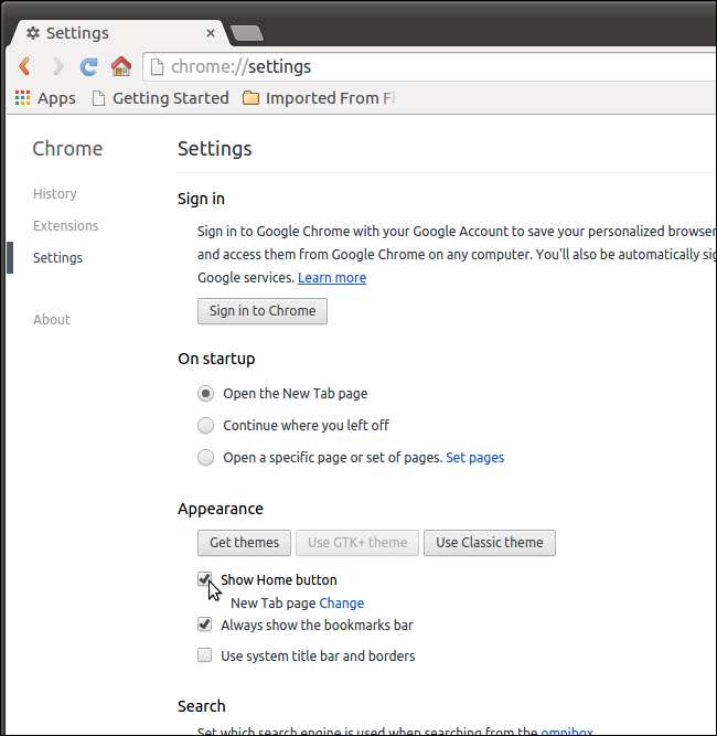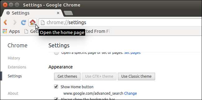 Ecranul „Setări” se afișează inițial atunci când deschideți Chrome pentru prima dată, permițându-vă să personalizați browserul. De exemplu, butonul „Acasă” din Chrome nu este afișat în mod implicit pe bara de instrumente, deci poate doriți să îl adăugați. Pentru a adăuga butonul „Acasă” la bara de instrumente, faceți clic pe caseta de selectare „Afișați butonul Acasă” din secțiunea „Aspect” a ecranului „Setări”. Butonul „Acasă” este adăugat imediat la bara de instrumente.