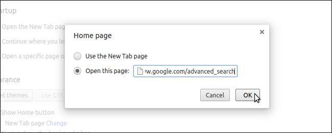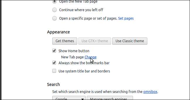 În mod implicit, pagina „Filă nouă” este afișată când faceți clic pe butonul „Acasă”. Cu toate acestea, îl puteți schimba în orice adresă URL doriți. Pentru a face acest lucru, faceți clic pe linkul „Modificare” de lângă „Pagina Filă nouă” sub caseta de selectare „Afișați butonul Acasă”.