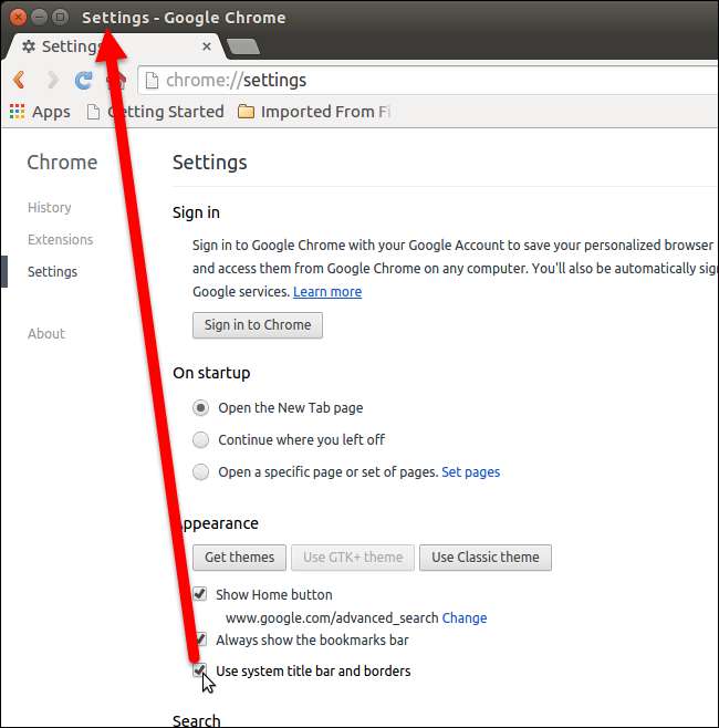 Bara de titlu nu este afișată în mod implicit pe fereastra Google Chrome. Pentru a schimba acest lucru, faceți clic pe caseta de selectare „Utilizați bara de titlu a sistemului și marginile” din secțiunea „Aspect” a ecranului „Setări”. Bara de titlu și butoanele ferestrei sunt adăugate imediat în partea de sus a ferestrei Chrome.