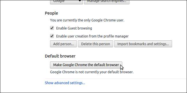 Dacă doriți ca Google Chrome să fie browserul dvs. implicit, faceți clic pe butonul „Setați Google Chrome browserul implicit” din secțiunea „Browser implicit” din ecranul „Setări”.