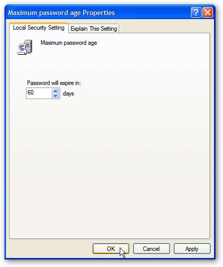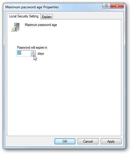Aici puteți schimba vârsta maximă a parolei la ceea ce doriți. În mod implicit, este de 42 de zile, dar îl puteți schimba de la 1 la 999 de zile. Când ați terminat, faceți clic pe OK și închideți Editorul de politici de securitate local.