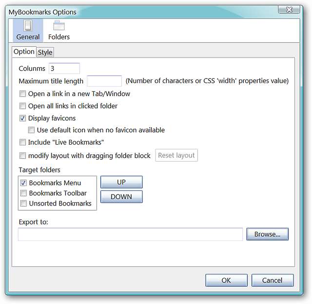 Aici puteți specifica numărul de coloane, lungimea titlului pentru numele marcajelor, alegeți opțiunile pentru deschiderea linkurilor, afișarea faviconului, includerea marcajelor live dacă doriți, activarea modificării aspectului și grupurile de foldere care trebuie incluse.