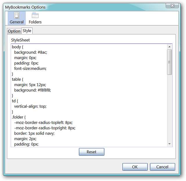 Dacă vă place ideea de a personaliza aspectul paginii MyBookmarks, veți putea face tot felul de modificări în Foaia de stil pentru extensie. Observați că există un „buton de resetare” dacă se încurcă ceva sau decideți că vă place cel mai bine aspectul implicit ( teribil! ).
