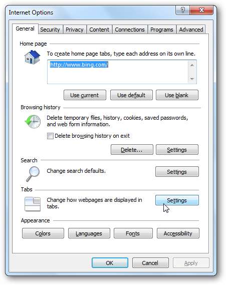 Apasă pe Setări butonul de sub Filele secțiunea din fila frontală din dialogul Opțiuni.