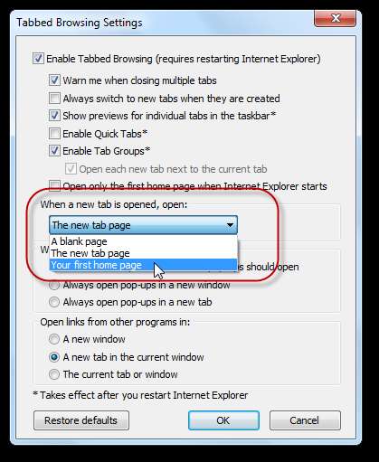 Faceți clic pe meniul derulant de sub Când se deschide o filă nouă și selectați ce doriți să deschideți atunci când creați o filă nouă. Puteți alege ca IE 9 să afișeze o filă necompletată, pagina dvs. de pornire sau noua pagină a filelor, ca înainte. Clic O.K pentru a salva modificările și veți vedea noile setări în acțiune data viitoare când deschideți o filă nouă în IE 9.