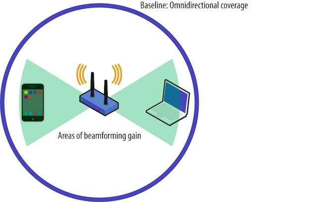 - O metodă alternativă de transmisie este de a focaliza energia către un receptor, un proces numit formarea fasciculului. Cu condiția ca AP să aibă suficiente informații pentru a trimite energia radio preferențial într-o singură direcție, este posibil să se ajungă mai departe. Efectul general este ilustrat în Figura 4-1 (ilustrată aici). Beamforming focalizează energia către un client, cum ar fi computerul laptop din partea dreaptă a figurii. Panele ilustrează zonele în care focalizarea formării fasciculului crește puterea și, prin urmare, raportul semnal-zgomot și ratele de date. Transmiterea preferențială în oglindă spre stânga este un efect comun al focalizării energiei într-un sistem cu elemente de antenă limitate. Cu toate acestea, concentrarea energiei către laturile stânga și dreapta ale figurii înseamnă că domeniul AP în alte direcții este mai mic.