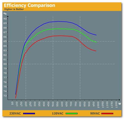 Veți vedea că eficiența nu este o valoare constantă, ea variază foarte mult în funcție de sarcina aplicată la alimentator. Veți vedea asta 900W Alimentator cu putere redusă ( 50W la 200W ), curba este atât de abruptă încât o creștere a sarcinii va atrage după sine o creștere substanțială a eficienței.