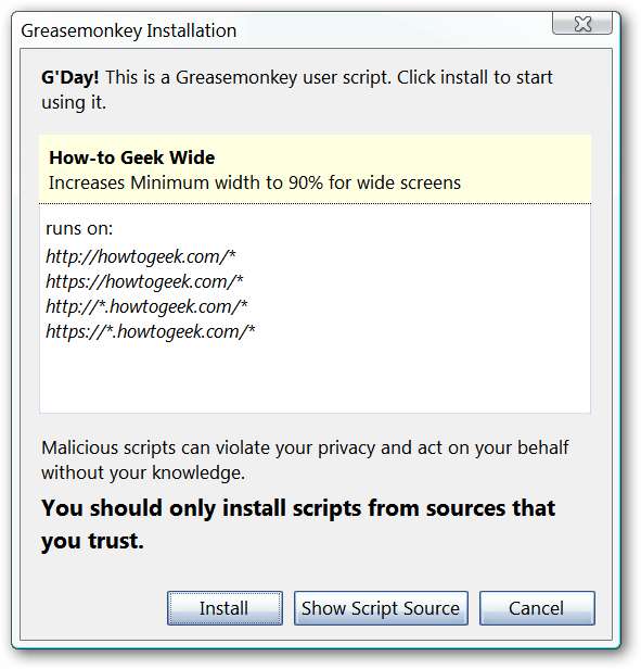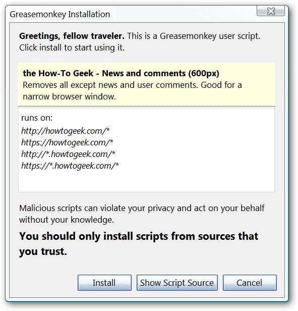 Acesta este unul dintre lucrurile minunate legate de utilizarea Greasemonkey ... se verifică întotdeauna cu dvs. pentru a vă asigura că nu sunt adăugate scripturi neautorizate.