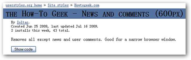 Când vizitați site-ul Web UserStyles, veți putea vizualiza informații de bază despre script și puteți vedea codul în sine, dacă doriți.