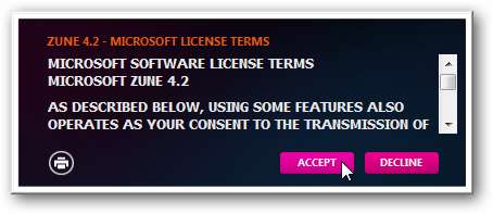 Odată ce descărcarea este terminată, rulați programul de instalare pentru a configura Zune pe computer. Acceptați EULA când vi se solicită.