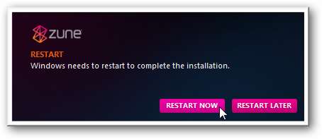 Vă poate solicita să reporniți computerul după instalare; faceți clic pe Repornire acum pentru a putea continua configurarea Zune. Repornirea pare să fie pentru suportul dispozitivului Zune, iar programul a funcționat bine în caz contrar, fără repornire, deci ați putea sări peste acest pas dacă nu utilizați un dispozitiv Zune. Cu toate acestea, pentru a fi sigur, continuați și reporniți.