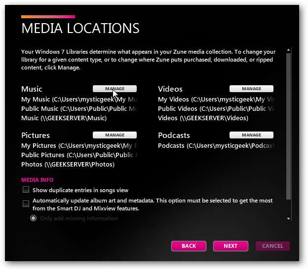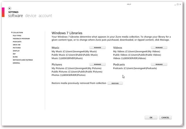 Dacă alegeți să modificați setările implicite, puteți schimba modul în care Zune găsește și stochează fișiere media pe computer. În Windows 7, Zune va utiliza în mod implicit bibliotecile Windows 7 pentru a vă gestiona media și, de fapt, va adăuga o nouă bibliotecă Podcasts la Windows 7.
