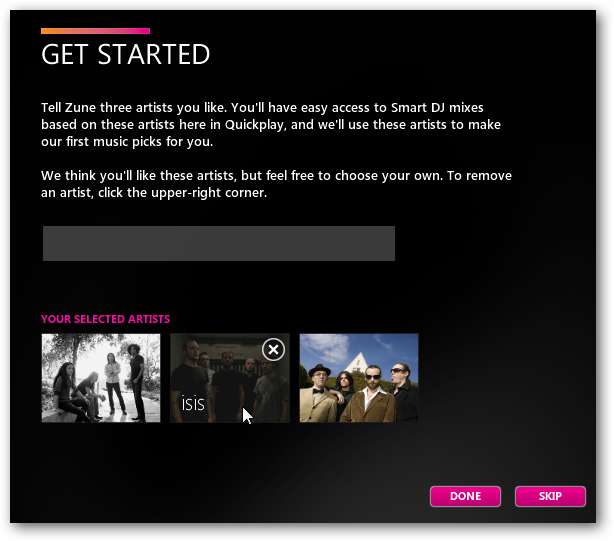 Există un ultim pas. Introduceți trei dintre artiștii dvs. preferați, iar Zune va adăuga mixaje Smart DJ în lista dvs. Quickplay pe baza acestora. Este posibil ca unii artiști mai puțin renumiți sau populari să nu fie recunoscuți, deci este posibil să trebuiască să încercați altul dacă alegerea dvs. nu este disponibilă. Sau puteți să dați clic pe Omite dacă nu doriți să faceți acest lucru chiar acum.