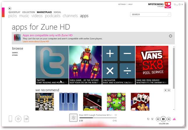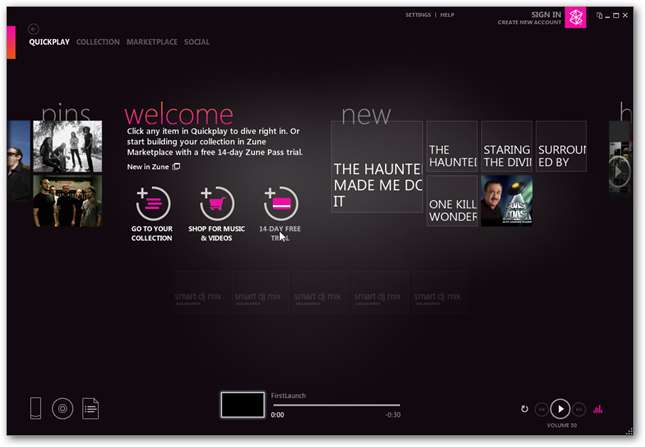 După repornire, lansați Zune. Va reda un videoclip drăguț de introducere la prima lansare; apăsați pe skip dacă nu doriți să-l urmăriți.