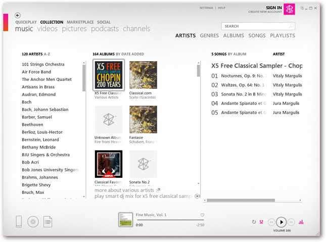 Pentru a accesa conținutul media, faceți clic pe linkul Colecție din stânga sus. Zune va afișa toate media pe care le-ați stocat deja pe computer, organizate după artist și album.