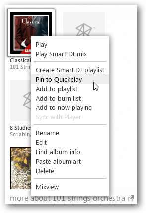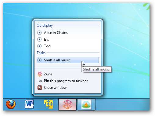 Chiar și mai multe controale sunt disponibile din lista de salturi a lui Zane în Windows 7. Puteți accesa direct linkurile Quickplay sau puteți alege să amestecați toată muzica fără a părăsi bara de activități.