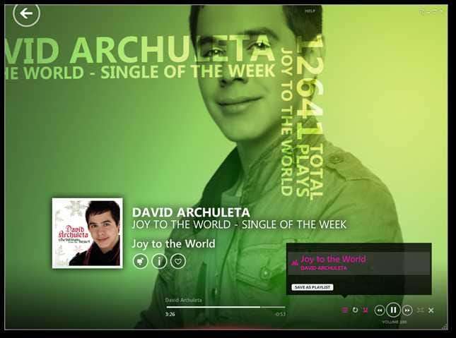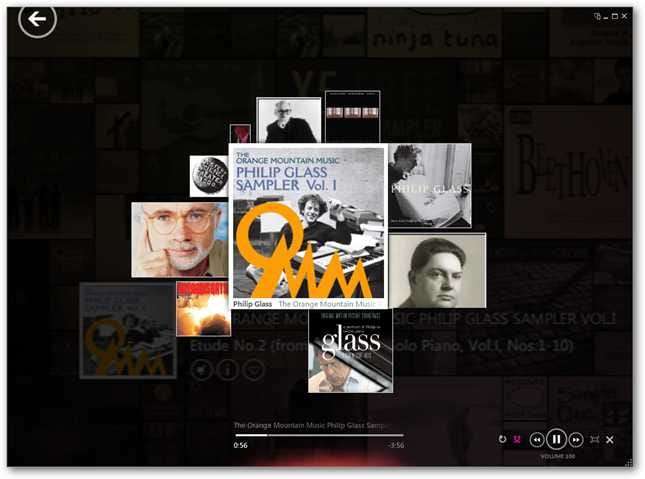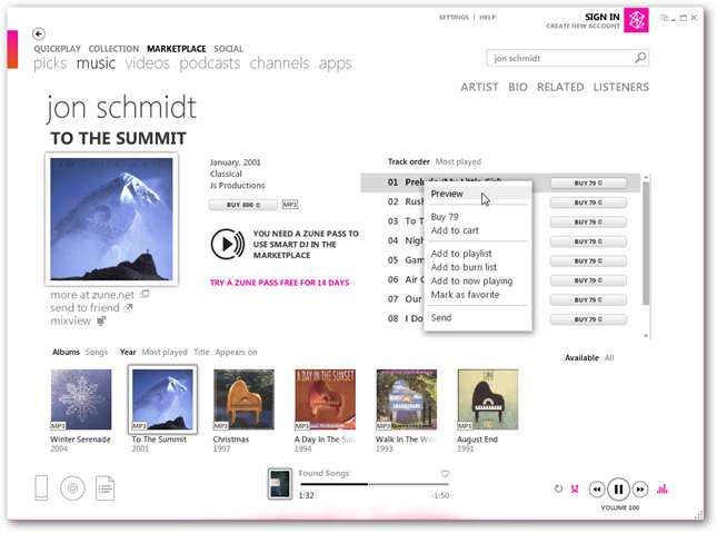 Când redați conținut media, îl puteți vizualiza în mai multe moduri unice. În primul rând, vizualizarea implicită Mix va afișa piese asociate cu muzica pe care o redați de la Smart DJ. Puteți să le jucați complet dacă sunteți abonat la Zune Pass sau, în caz contrar, puteți juca previzualizări de 30 de secunde.