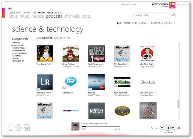Zune oferă, de asemenea, o selecție largă de podcast-uri la care vă puteți abona gratuit.