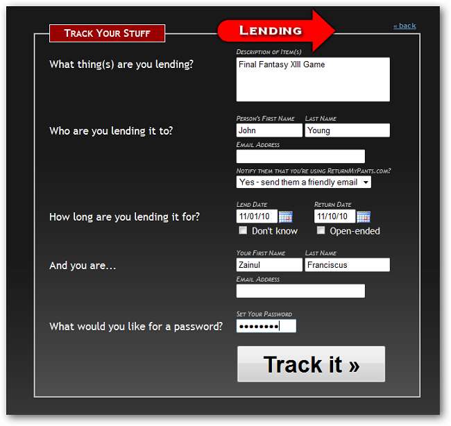 ReturnMyPants folosește un formular simplu pentru a vă permite să înregistrați detaliile articolelor pe care le-ați împrumutat sau le-ați împrumutat de la prietenul dvs.