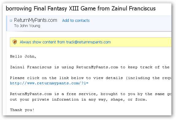 Prietenul dvs. va primi un e-mail prietenos de la ReturnMyPants pentru a-i anunța că îi urmăriți împrumutul.