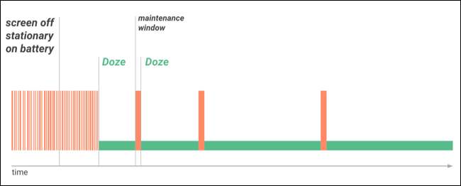 Doze începe când nu vă folosiți dispozitivul. Dacă nu v-ați atins telefonul de ceva timp, acesta va intra într-un mod de adormire mai profund. (În termeni tehnici, Doze previne wakelocks de la trezirea dispozitivului, menținerea acestuia într-o stare de repaus cu putere redusă.) În această stare, numai notificările cu prioritate ridicată, cum ar fi apelurile telefonice și mesajele de chat, vor trezi telefonul. Aplicațiilor nu li se va permite sincronizarea constantă în fundal. În schimb, Android oferă „ferestre de întreținere inactivă” din când în când, unde aplicațiile își pot face toată munca într-un singur lot mare. Pe măsură ce timpul trece fără ca dvs. să utilizați telefonul, acele ferestre se separă din ce în ce mai mult.
