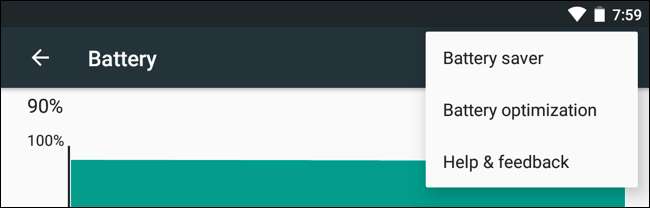 Pentru a găsi setările Doze, deschideți aplicația Setări de pe dispozitivul dvs. Android, atingeți „Baterie”, atingeți butonul meniu și atingeți „Optimizarea bateriei”.