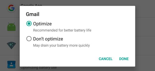 În mod prestabilit, fiecare aplicație va fi optimizată și veți vedea sub listă expresia „Optimizarea utilizării bateriei”. Pentru a preveni somnul unei aplicații, atingeți-o în listă și selectați „Nu optimizați”. Android va permite acelei aplicații să ruleze în fundal, chiar și în timp ce dispozitivul dvs. dormește. Ar trebui să faceți acest lucru numai dacă o aplicație nu funcționează corect sau dacă aveți cu adevărat nevoie de notificări actualizate pentru aplicația în cauză. Majoritatea aplicațiilor vor dormi corect și nici nu ar trebui să observați diferența.