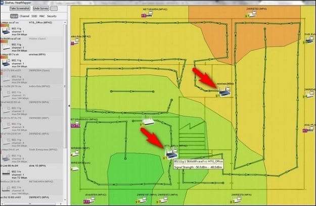 - După ce am terminat de parcurs întreaga hartă, HeatMapper a identificat locația celor două puncte de acces din biroul nostru cu o precizie extraordinară. Uită-te la săgețile roșii de pe harta de mai jos: