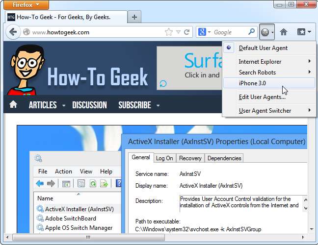 Veți dori să instalați fie User-Agent Switcher pentru Chrome sau User Agent Switcher pentru Firefox , în funcție de browserul pe care îl utilizați. Pentru Internet Explorer, poate doriți să încercați UAPick User-Agent Switcher add-on.