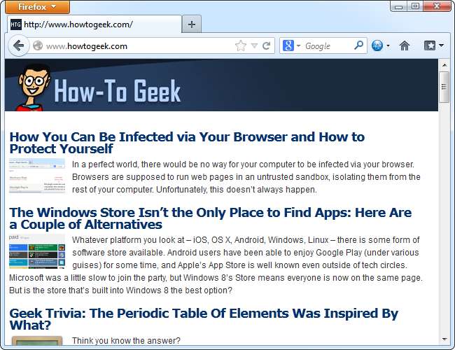 Reîmprospătați pagina pe care vă aflați în prezent (faceți clic pe pictograma Reîmprospătare de pe bara de instrumente sau pur și simplu apăsați F5) și veți vedea versiunea sa mobilă. Puteți accesa alte site-uri web și veți vedea versiunile lor mobile atâta timp cât agentul dvs. de utilizator este setat la un agent de utilizator mobil.